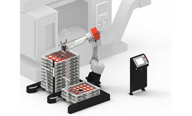 Hochflexibles, kompaktes Automatisierungssystem, das speziell für das Beladen und Entladen von mittleren bis großen Serien von Frästeilen entwickelt wurde. Das Rohmaterial wird auf dem einem Rack angeliefert; die fertigen Werkstücke werden auf dem anderen Rack abgelegt. Die Racks können aufeinander gestapelt werden.