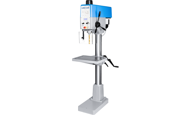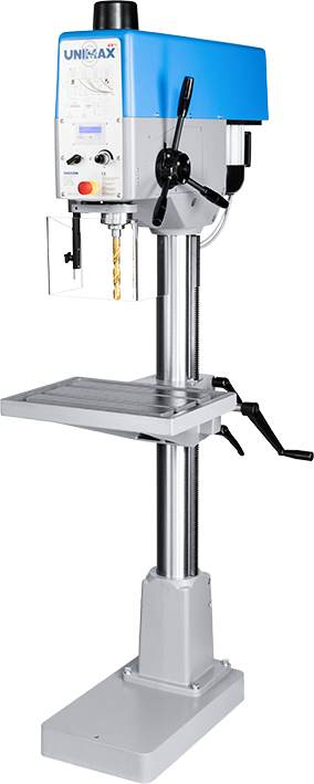 Moderne, präzise Produktionssäulenbohrmaschine nach bewährtem UNIMAX 3-Konzept mit stufenlosen Vorschubantrieb, automatischem Werkzeugauswerfer und serienmäßiger Spanbruchsteuerung. Im digitalen Display wird sowohl Vorschub, Drehzahl als auch Bohrtiefe angezeigt.